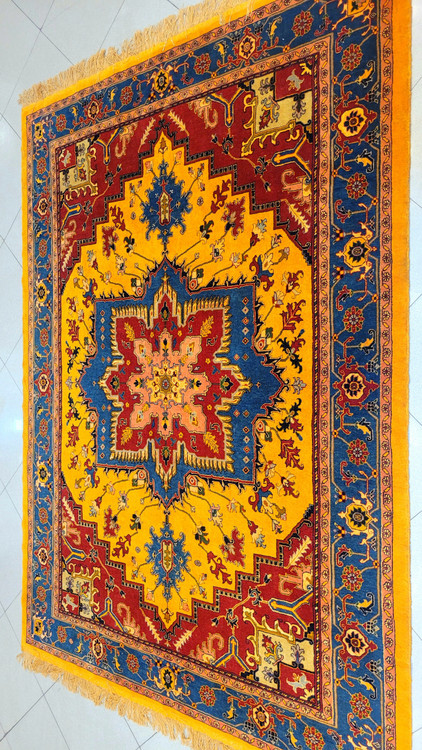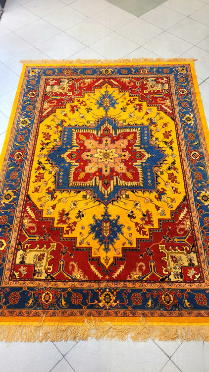 این فرش دستباف ۴ متری با زمینه زرد عنابی و نقوش آبی درباری، یکی از جذابترین ترکیبها برای چیدمانهای مدرن و کلاسیکه.