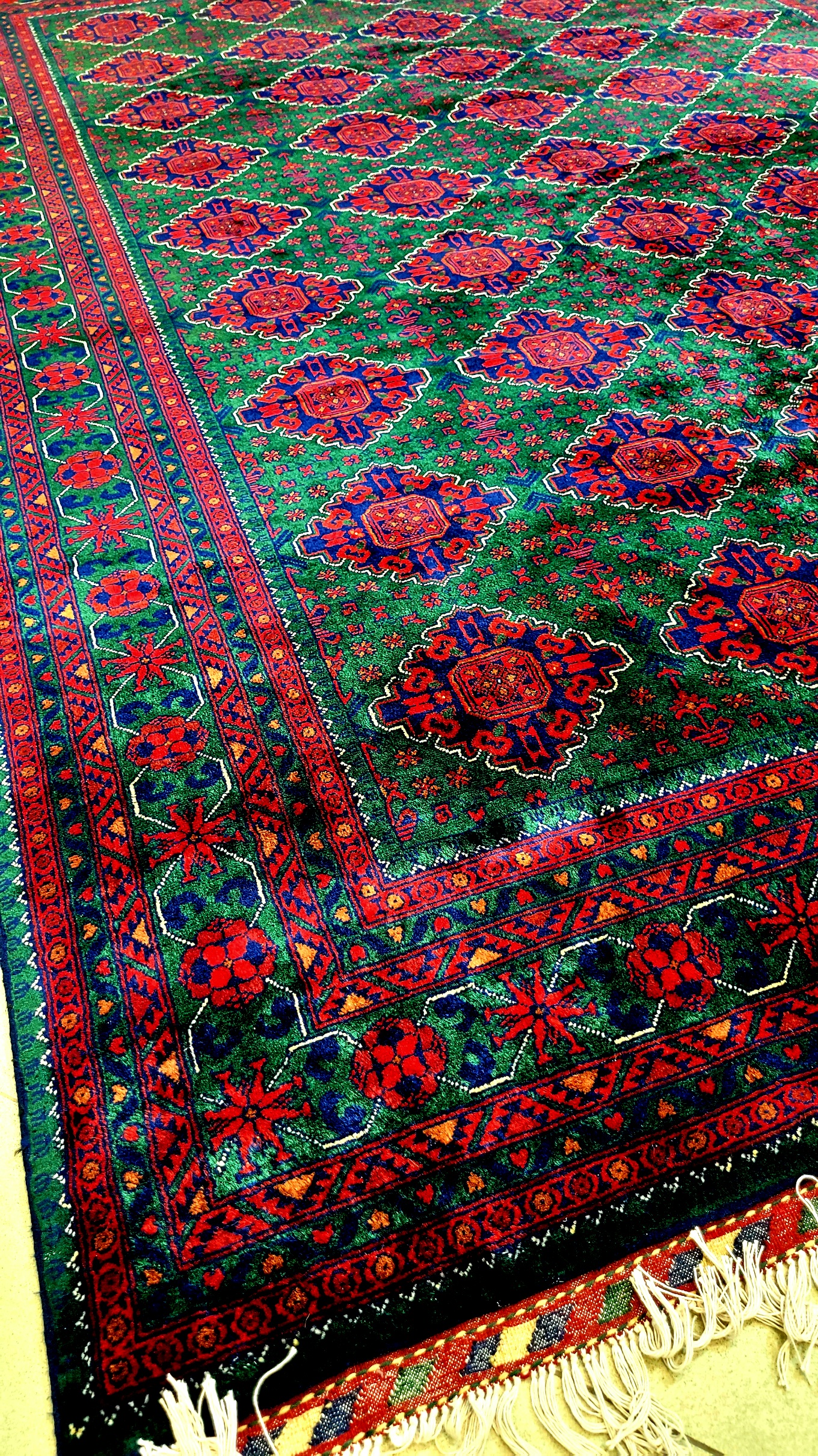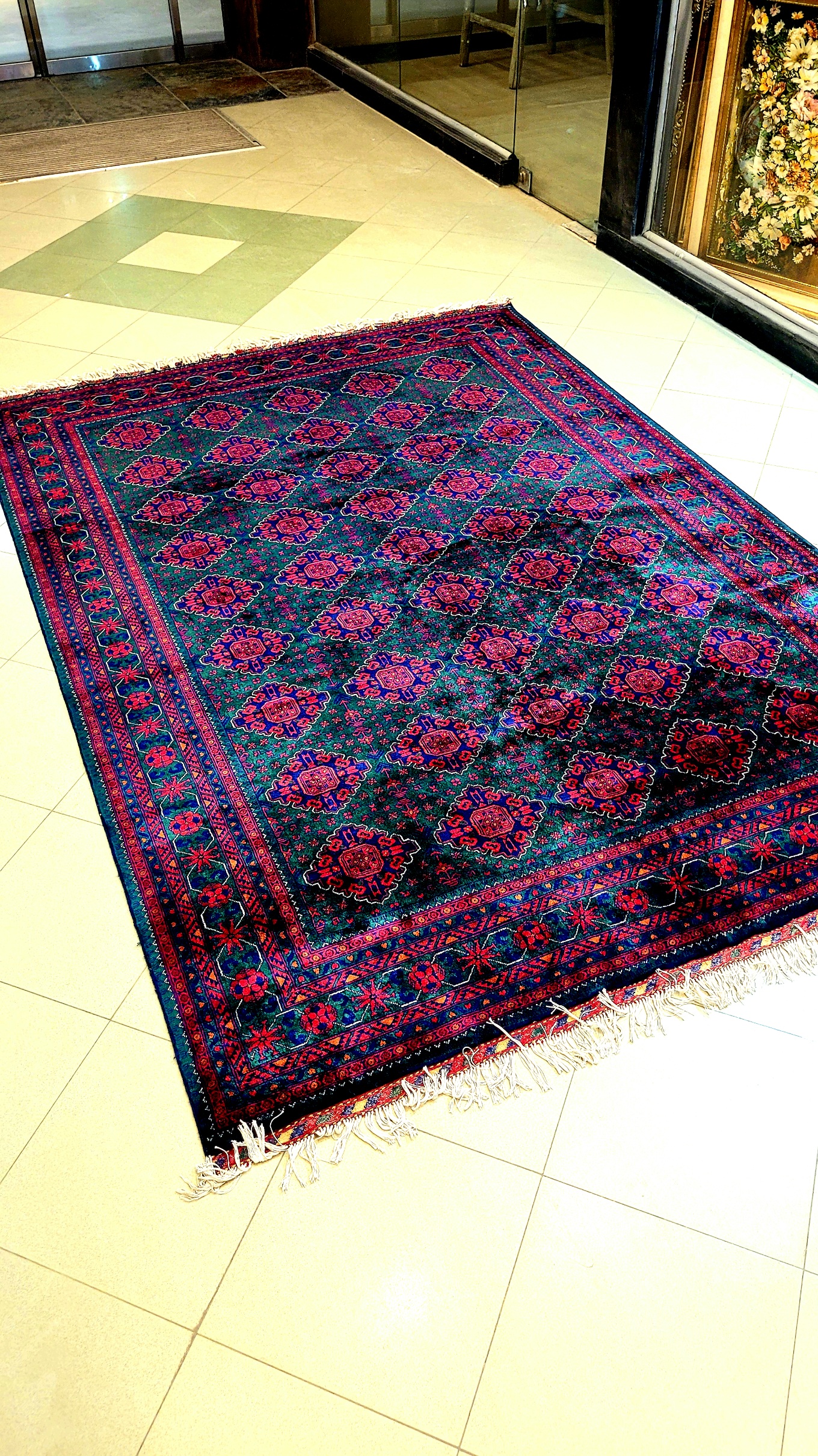 فرش دستبافت کرک مرینوس نقشه قابی ۲۰۰×۳۰۰ — رنگ گیاهی سبز و قرمز