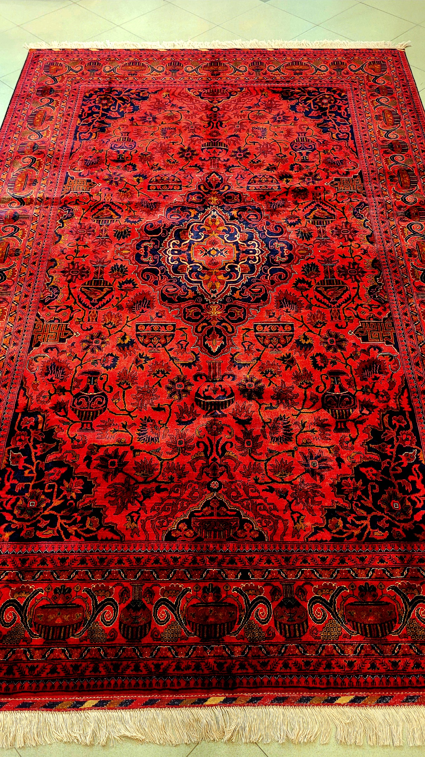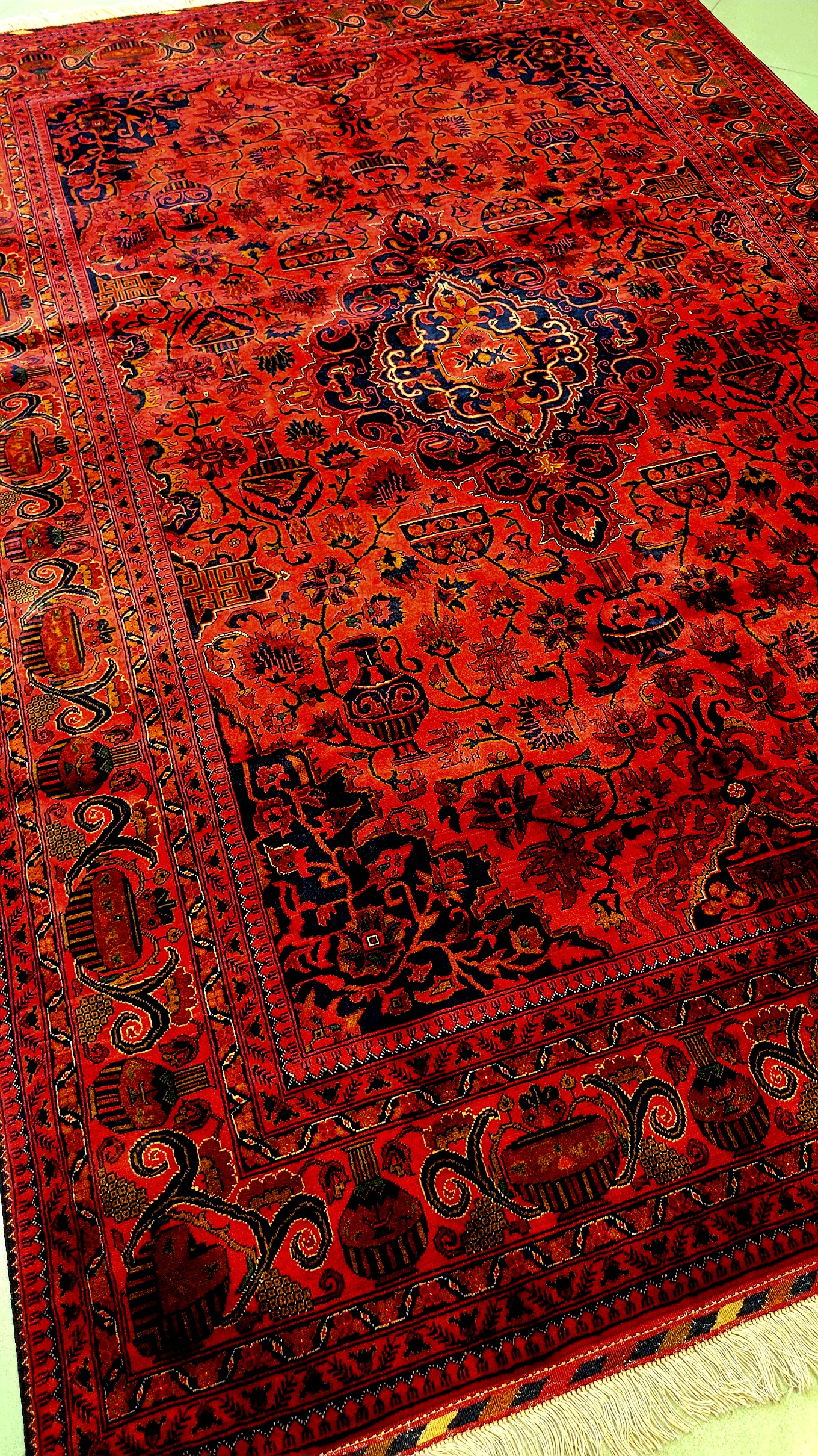فرش دستبافت کرک مرینوس نقشه کاسه کوزه یا جام شراب رنگ گیاهی لاکی 200*300ابعاد